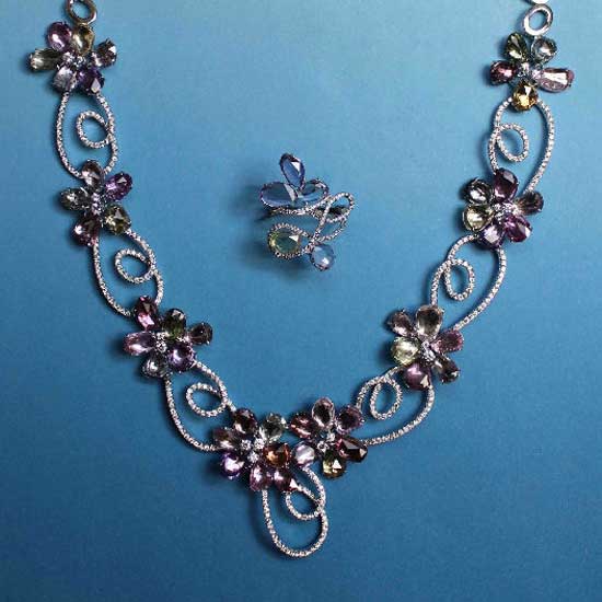 Displayed is a sapphire jewelry set that comes with a necklace and a ring. Crafted with sapphires accented with diamonds, the necklace and ring are designed in floral patterns for an elegant look. This tasteful sapphire jewelry set is a good match with cocktail dresses.