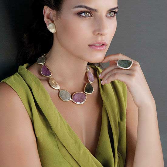 This elegant jewelry set includes a necklace and a ring. The items features multicolor sapphires embedded in gold settings. The well-designed set goes well with your stylish outfits.