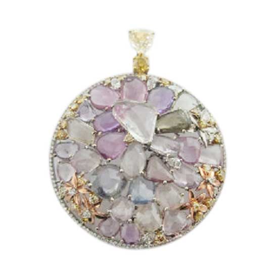 This is a pendant in a round shape with a deluxe and stunning design. It is meticulously inlaid with multiple sapphire stones in assorted shapes and colors. The floral embellishments add a feminine and elegant touch to this pendant.