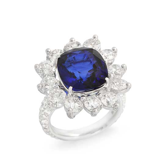This elegant ring features a cushion-cut sapphire mainstone surrounded small white diamonds. The body of the ring is constructed from shiny 18k white gold. It is a great addition to your jewelry collection.