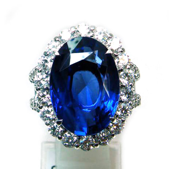 This finger ring appeals to people with its stunning, luxurious and sophisticated appearance. It features a platinum mounting and is accented with a sapphire stone centerpiece. The centerpiece is encircled with shimmering diamond elements.