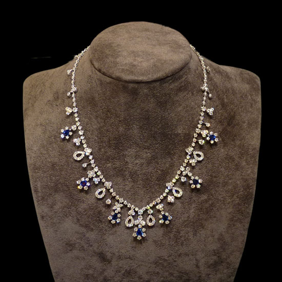 This white gold statement necklace is gorgeously adorned with diamonds and blue sapphires. Meticulously made, the diamonds and gemstones exhibit excellent radiance and translucency. Brilliant and feminine, this refined necklace is in sync with ladies' elegance.