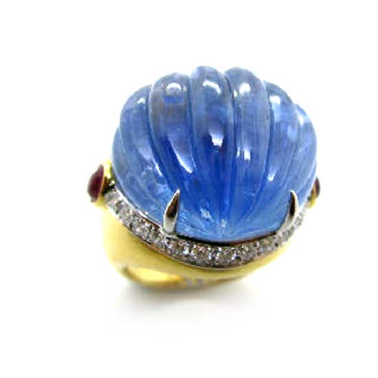 This is a stunning finger ring boasting a deluxe and eye-catching design. The blue centerpiece is a sapphire stone which is carved in a unique shape. The golden mounting is paved with a line of diamonds for adding sparkling luster to this piece.
