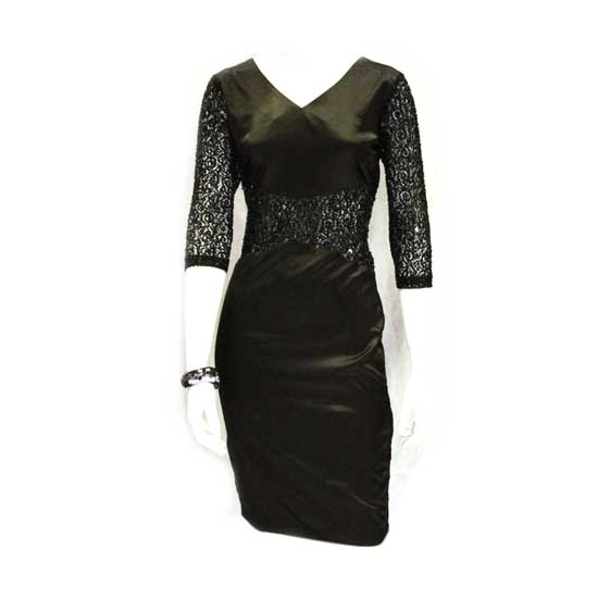 The satin dress comes with an alluring plain black design. It features a mix of silky satin and lace fabrics, offering an engaging contrast. The dress is also done with delicate hand bead work for enhanced appeal.