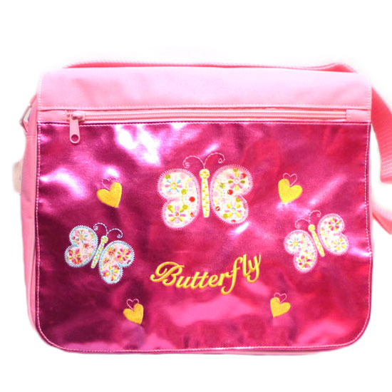 - Pink metallic PU with butterfly appliqué/embroidery for girls' school bags.