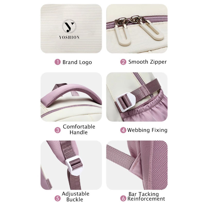 Smooth double zippers ensure easy opening and closing; a padded handle provides a comfortable grip; reinforced bar tacking at stress points enhances load-bearing capacity; and the branded logo adds a touch of quality.