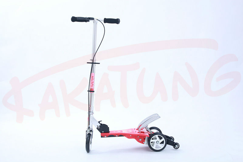 This scooter flaunts a stylish twin-tail design and has three wheels for moving. It has a durable aluminum construction with an adjustable handlebar. There is a brake system attached to the handlebar for added safety.