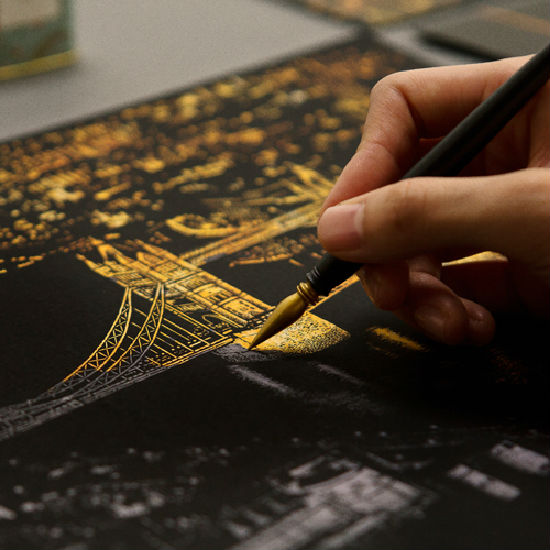 Inspired by scratch-board art, we created drawings to be scratched off to reveal another form of view. In this case, a glowing night view. Each scratch night view features a foil layer of hand-drawn sketches which can be scratched off to reveal a new level of color underneath. Scratch off to light up windows, buildings and streets. You do not have to trace off all lines. You can also add extra lights, clouds, water reflections on black backgrounds.