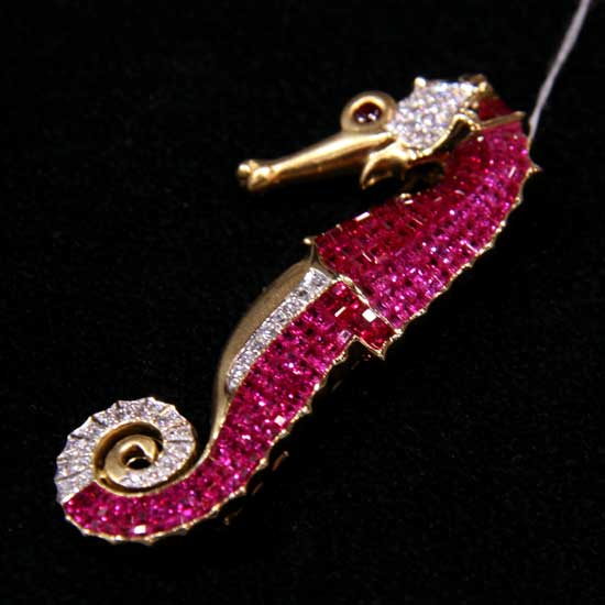 The lapel pin features a seahorse shape in a delicate design. It boasts an 18K gold construction and is fully set with rubies and diamonds for a sophisticated touch. This lapel pin makes an elegant way to complement your jewelry collection.