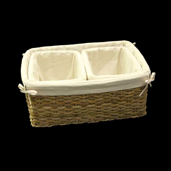 This elegant rectangular basket features a white cloth inside with bow decorations at corners. It is constructed from seagrass for a unique touch. This nice basket is great for home storage.
