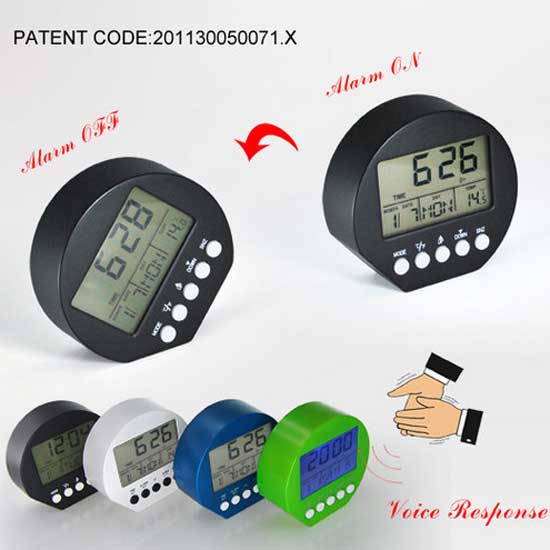 This novel LCD clock can automatically turn on its LCD backlight in response to external sound such as applauding. The smart LCD clock can turn on or off the alarm when you switch it to another angle. The plastic ABS housing comes with several colors for your selection.