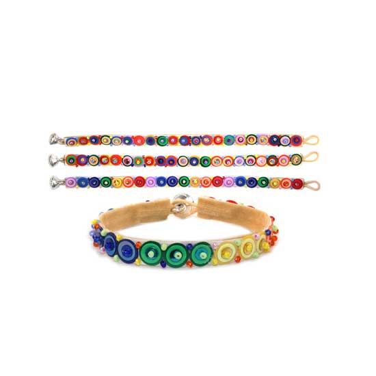This is a series of sequin bracelets that is finely handmade with exquisite details in India. Each bracelet is decorated with glass beads that come in a rainbow-colored combination. These stylish bracelets are secured with a small silvery-tone ball.