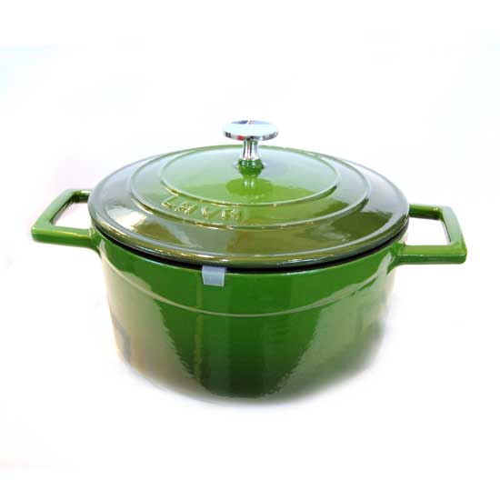Shown here is bright green round casserole made with cast iron and enamel. It can be used for cooking stews and soups. The beautiful color and shape of this casserole delights users visually too.