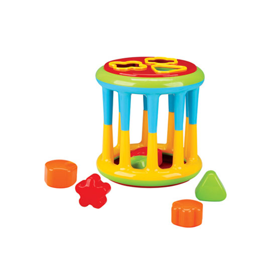 This is a shape sorting toy in vibrant colors. Children are required to put different shapes into the cage through the correct, corresponding holes. It helps train children's recognition of various colors and shapes.