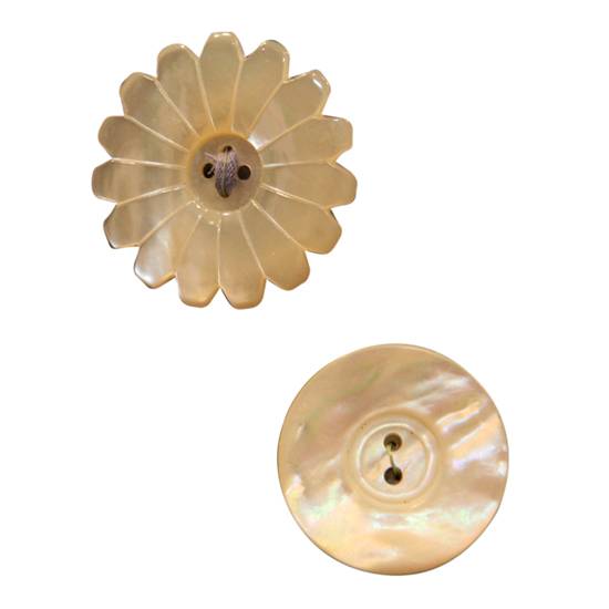These are shell buttons in different shapes. One is in flowery shape and another one is round in shape. These buttons can be used as decorations for clothes.