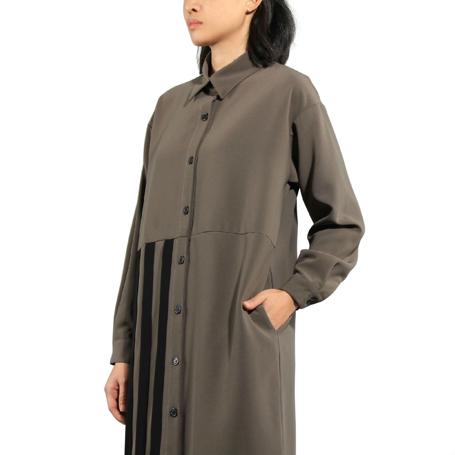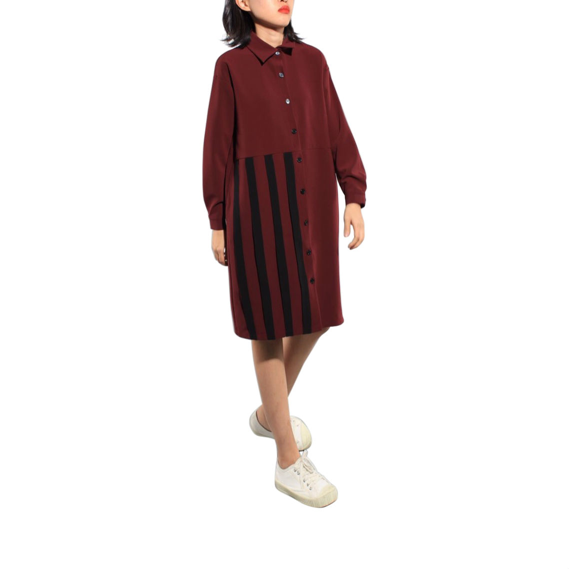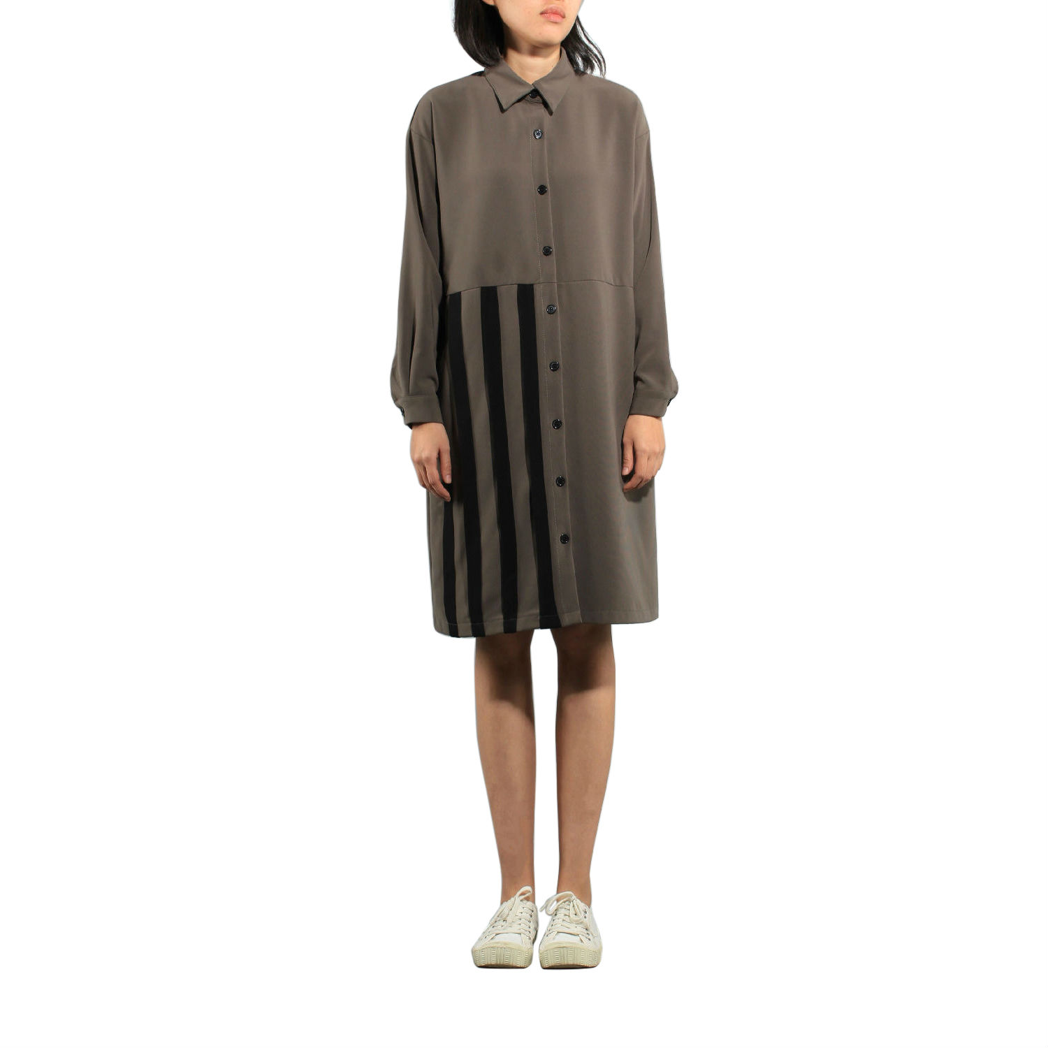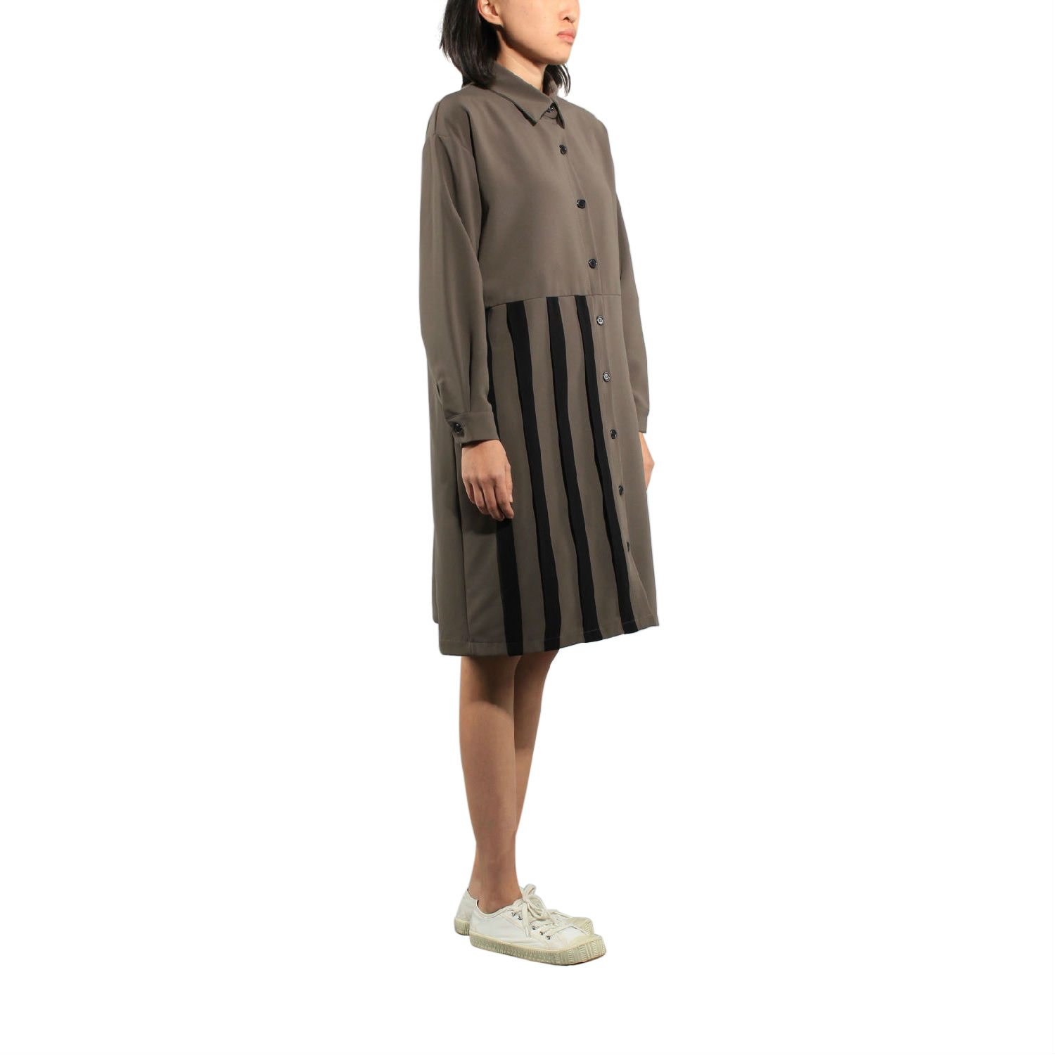 Demonstrating contemporary aesthetics in a minimalistic silhouette, this skirt dress is highlighted with crisp stripes on the right panel for a chic embellishment. This versatile piece can be worn as a dress or as a casual jacket with the button unfastened. Team it with sneakers for an effortless laid-back outfit.