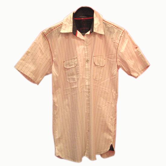The short-sleeved shirt is pink in colour with vertical stripes and hand embroideries.