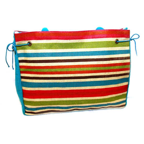 The shopping bags are styled with stripes in various cheerful colors. Its ample capacity promises reliable storage. The sides of its top are gathered respectively with trim blue strings.