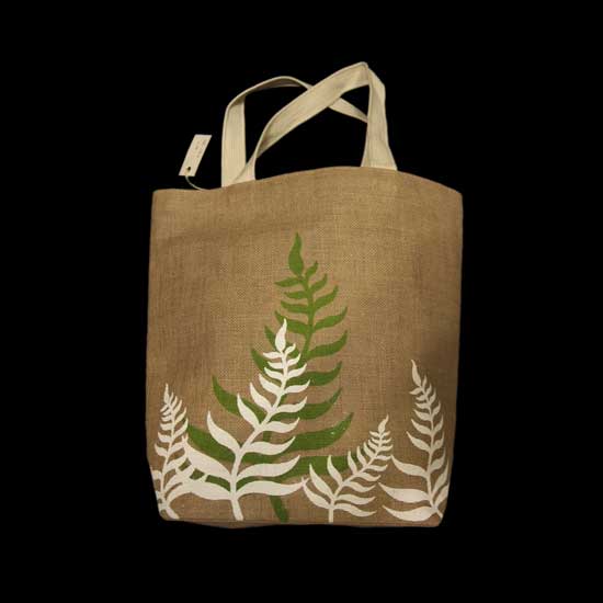 This shopping bag features a beige exterior with green and white leaf prints. The shopping bag is finished with a pair of white straps for carrying. Made of jute, the bag ensures a tough structure and exceptional durability.