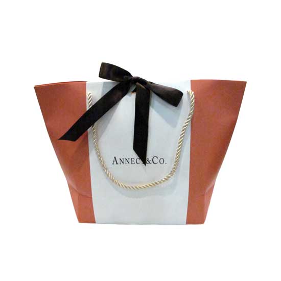 This is a shopping bag with a two-toned design. It is crafted in a trapezoid shape with yellow rope handles and a brown ribbon. The well-made bag is ideal for shopping and buying groceries