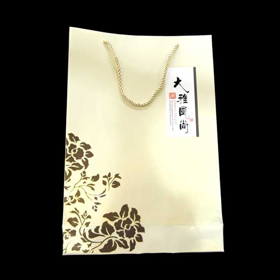 This well-designed shopping bag features brown floral prints on a light yellow surface. The bag fitted with sturdy handles is comfortable to carry. It is finely manufactured for extended durability.