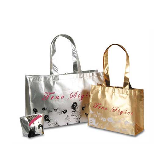 The displayed shopping bag features a shiny appearance for a chic touch. It is adorned with English words and characteristic patterns. There are assorted colors available for your selection.