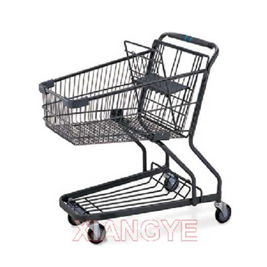The displayed shopping cart in dark gray comes in a Japanese style. It is constructed from carbon steel for durability and sturdiness. This reliable shopping cart is widely used in supermarkets.