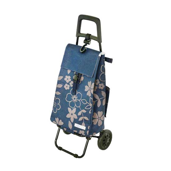 This navy shopping cart features elegant brown flower patterns on the exterior. It is equipped with big wheels for nimble movement. This shopping trolley bag is finished with a flap closure and a hook.