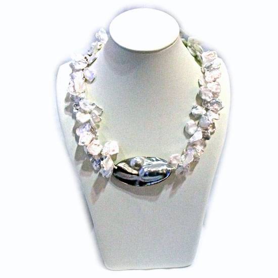 The short necklace features a cluster of irregular-shaped pearls, showcasing a sense of natural imperfection while boosting a glamorous touch. The gorgeous pearl barrel in center provides an interesting twist for a traditional look. Enhance your look with this stunning pearl necklace.