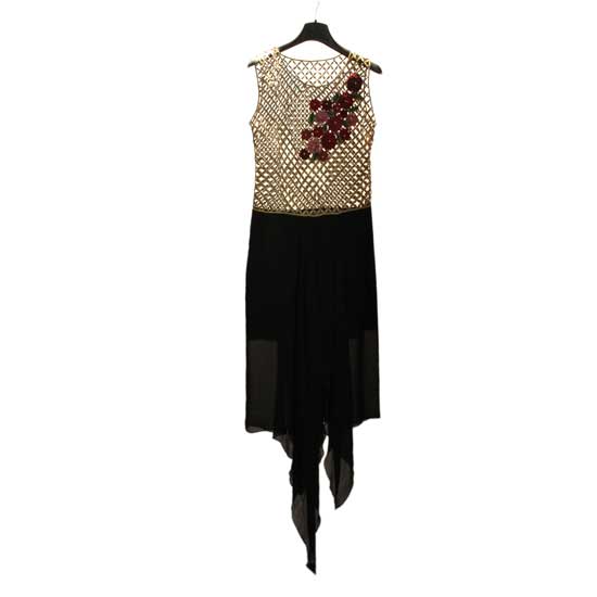 The short-sleeved dress features a georgette skirt in alluring black. It comes with an embroidered gold bodice trimmed with comely rosettes. The rosettes are also accented by shining Swarovski stones.