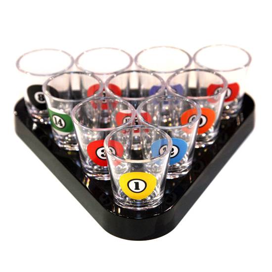 A set of shot glasses is made out of PS with snooker ball numbers printed on each of them, they are placed in a flat bottom plastic triangle for display.