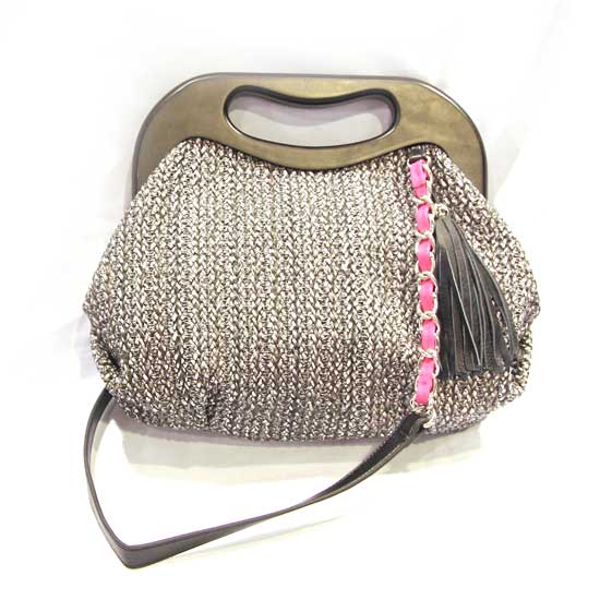 This is a ladies’ shoulder bag designed in a cute dumpling shape. The bag comes in silvery, matched with a wooden frame in a metallic color. The slim strap is adorned with chains for additional style.