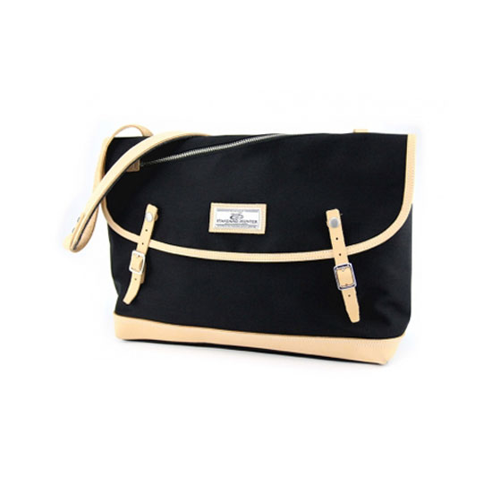 This is a shoulder bag made of robust nylon material in black. It is designed with beige leather accents for added uniqueness. This bag is a great accessory for your leisure outfit.