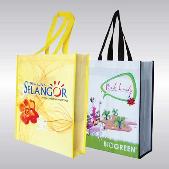 These non-woven shopping bags are finely printed with eye-catching advertisement. Laminated with PP film, the shopping bags are durable and waterproof. They are perfect for any business event and advertisement campaign.