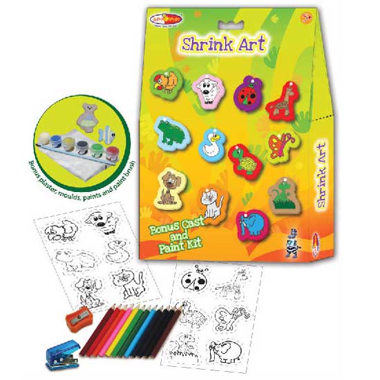 This shrink art set comes with 2 sheets of shrink dinks, 12 color pencils, 1 pencil sharpener, 1 hole puncher and 6 metal chains. The bonus pack included allows added fun and excitement. This shrink art set is a nice choice for artistic children.