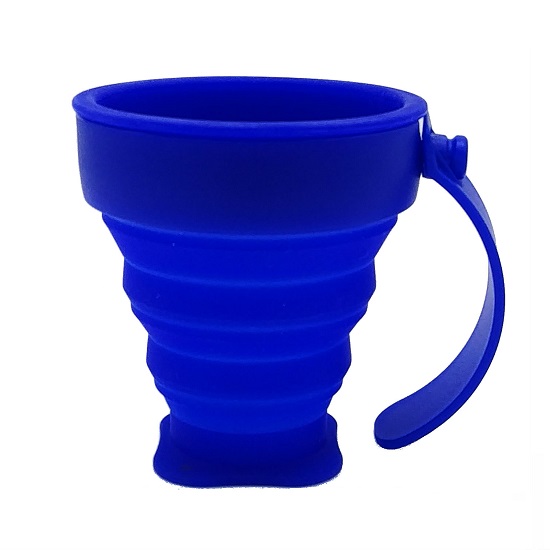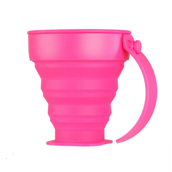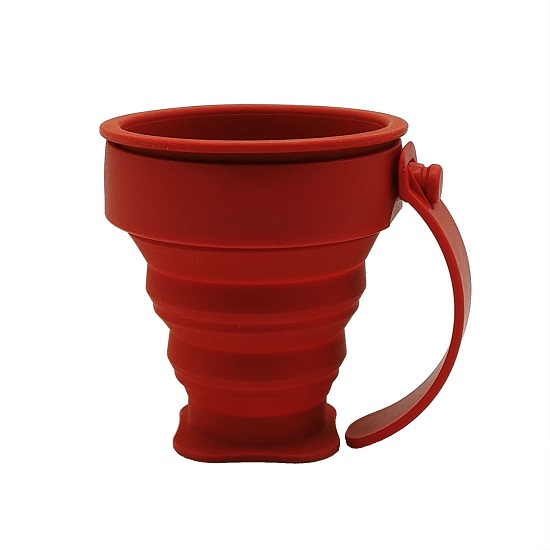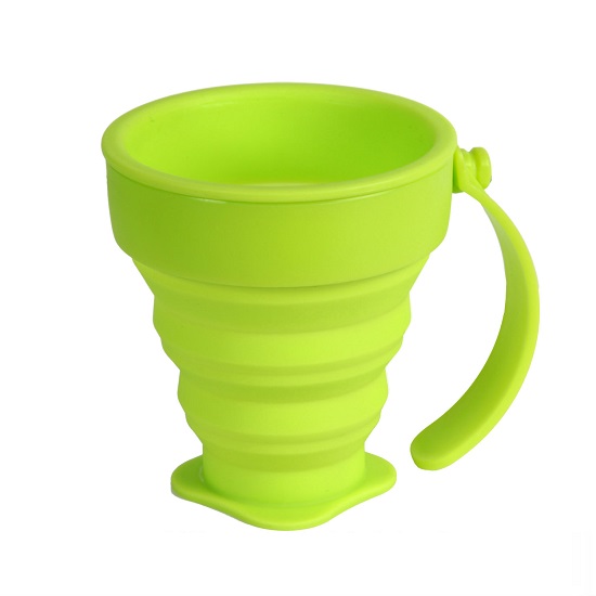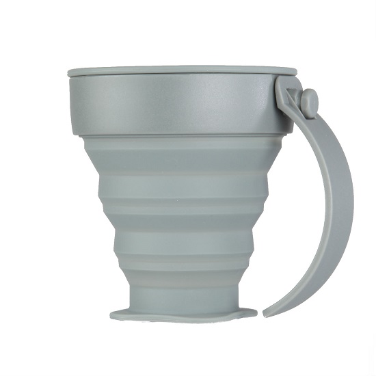 This mug is made of BPA free silicone material and has a capacity of 6oz (180 ml). It comes in a foldable design and can be folded flat for easy storage. The mug has a handle on the side for comfortable holding and is ideal for using as a promotional gift.