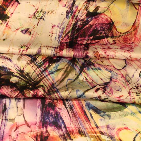 This piece of silk fabric offers a velvet, comfy touch to your skin. It showcases complex and abstract patterns done by quality digital printing. This special fabric will add a lot of visual interest to your product design.