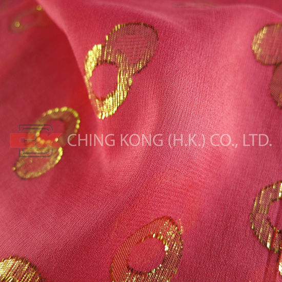 This sumptuous and eye-catching fabric features a bright red body with “8”-shaped pattern in a gold tone. It flaunts an ultra-soft texture with delicate workmanship. This durable fabric is suitable for making various garments, textile products like curtain, and so on.