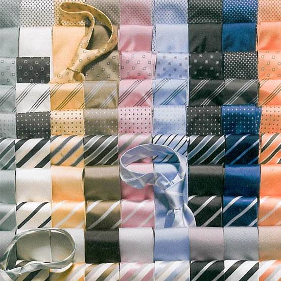 This picture features a large range of necktie printed with colorful designs. There are variety of patterns including stripes, plain, lattice and speckles. They are great clothing accessory for men to match with suits and other formal wear.