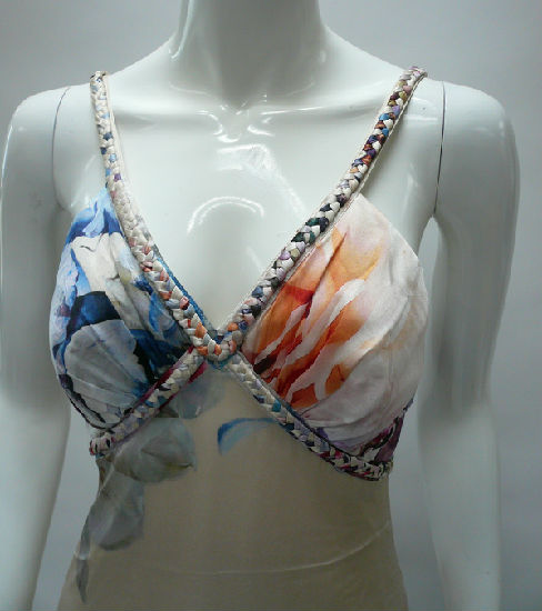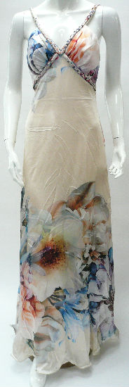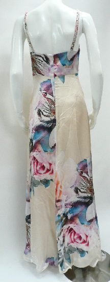 It is a floor-sweeping dress in light weight silk to create a beautiful movement when walking. The twisted shoulder strap is made of self fabric. It maximizes the silhouette with heels.
