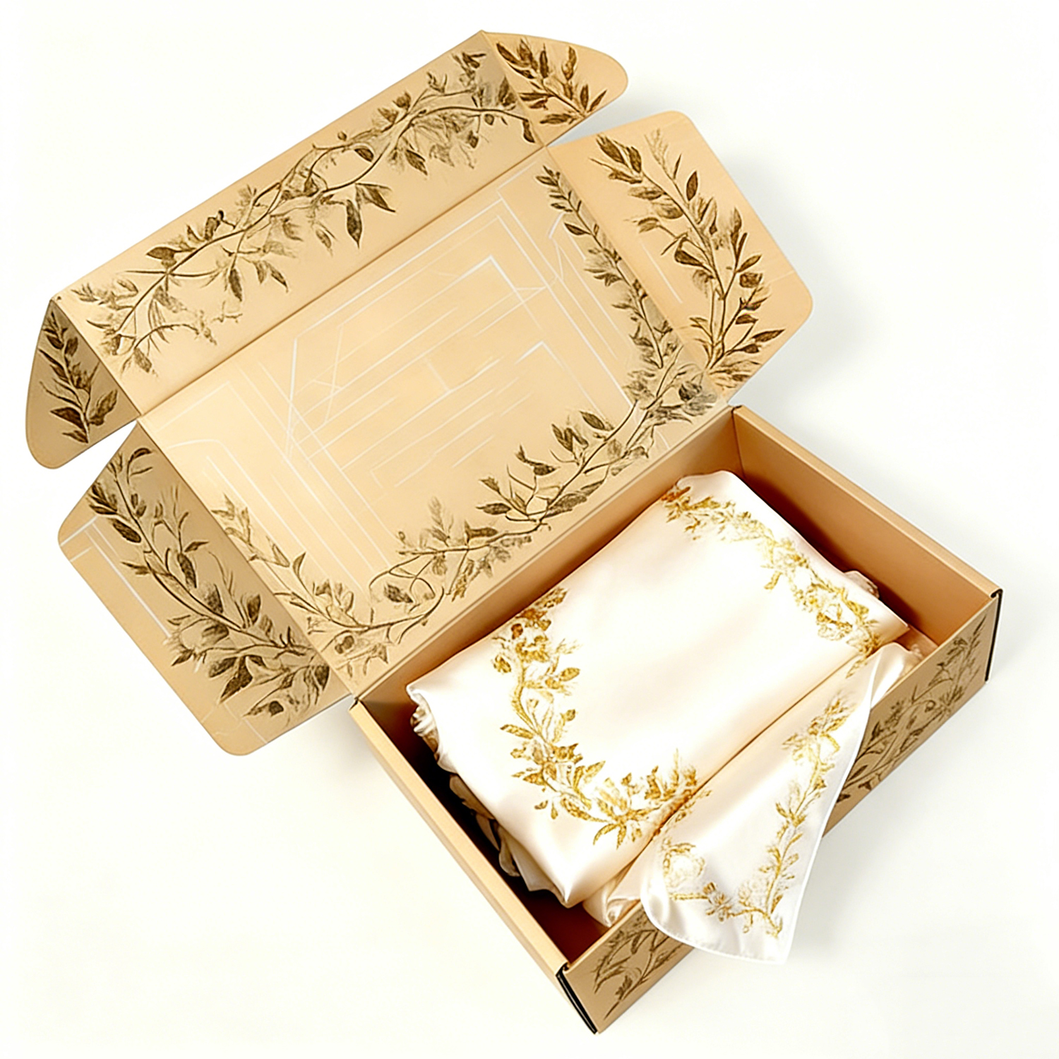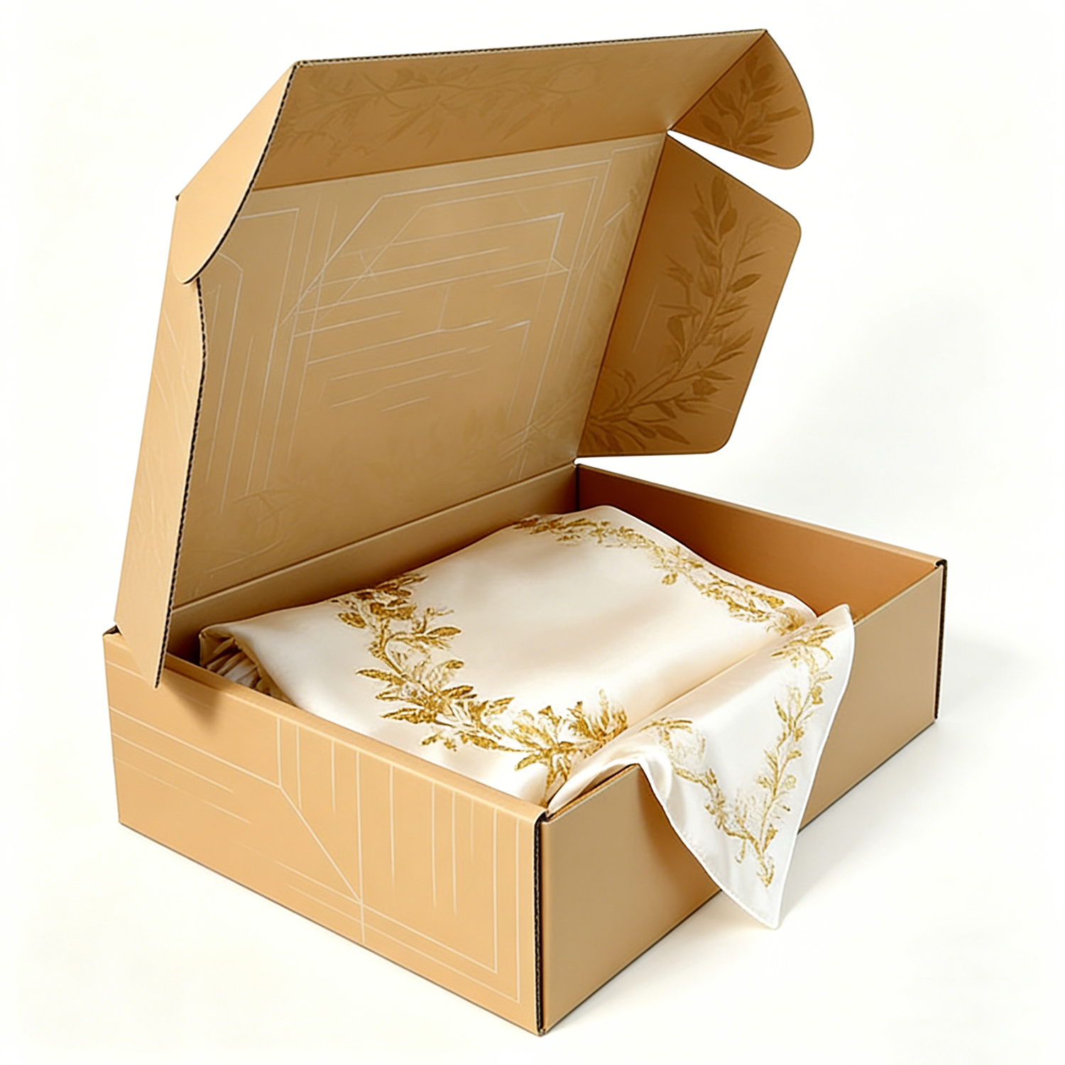Self-locking mailer box design Foldable structure for efficient storage and transport Reinforced edges for enhanced strength Secure lid closure without the need for adhesive Easy assembly for fast packaging operations The structure ensures that delicate fabrics such as silk remain protected during shipping, preventing creases, damage, or contamination.