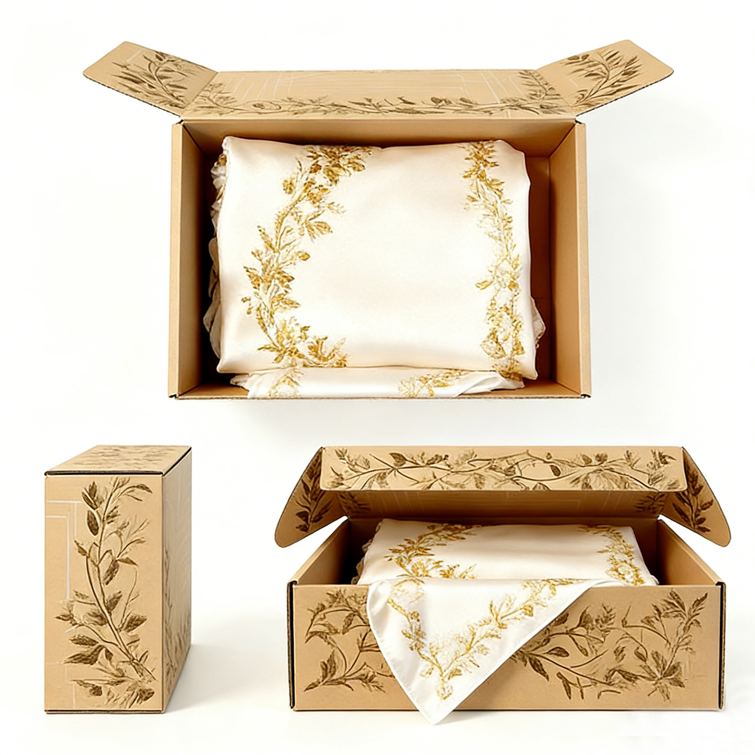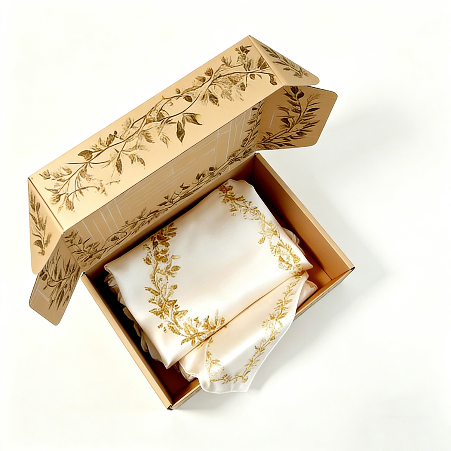 The defining feature of this silk shipping box is its botanical illustration design, inspired by nature and timeless elegance.