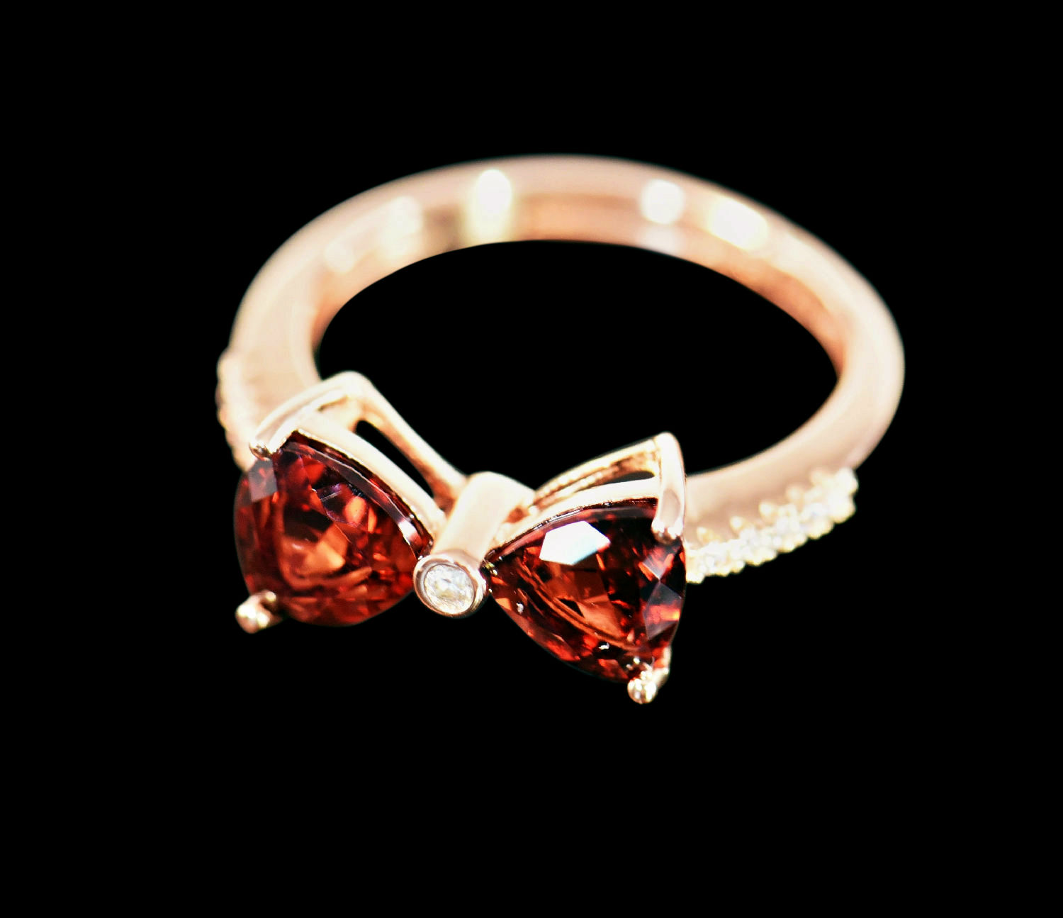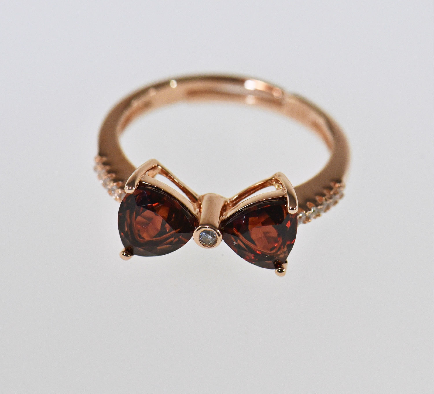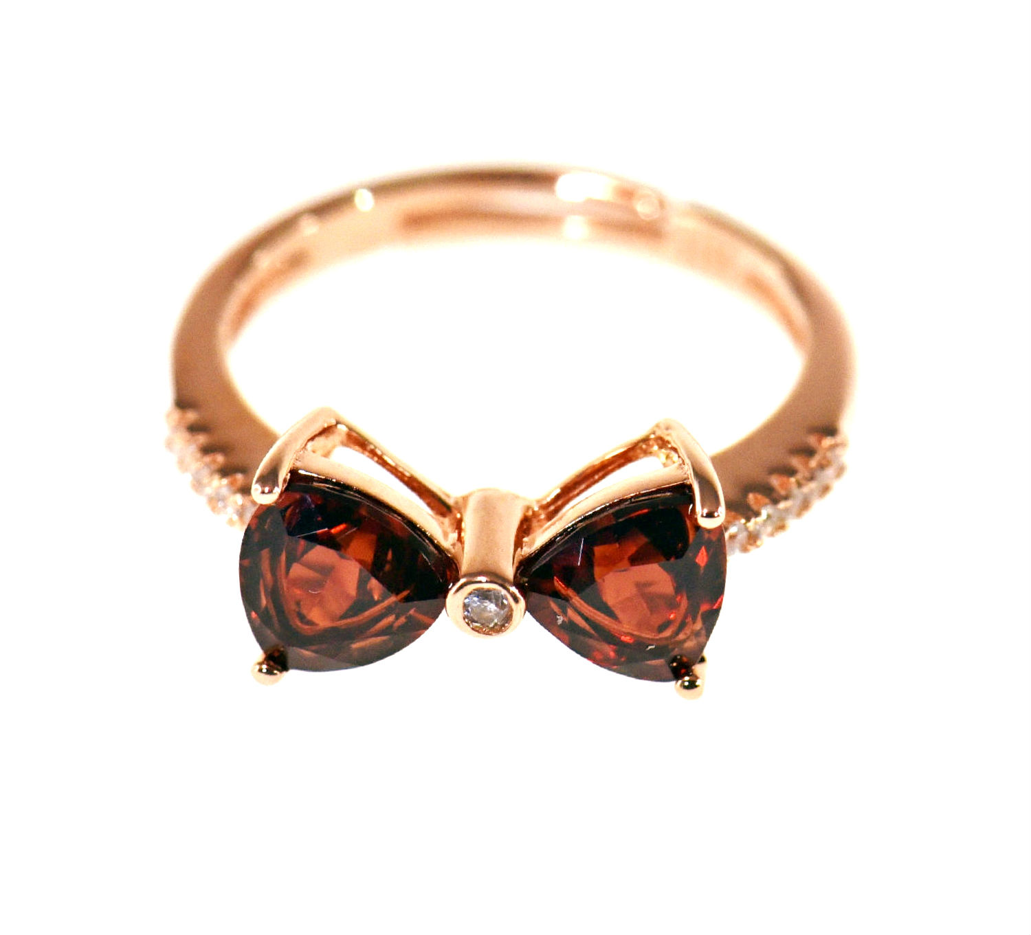With its two trilliant diamond-shaped, natural garnet stones arranged on both sides, this ring comes in a pretty bow design which pleases every lady. Apart from the single CZ at the center, other cubic zirconia can also be found paved on the 18K rose gold-plated ring shank.