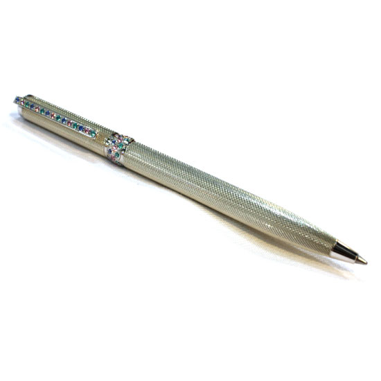 This stylish ball pen features a slim textured barrel constructed of silver. It is further accented with colorful sparkling stones on the pocket clip. The exquisite pen makes a special stationery gift for your friends or clients.