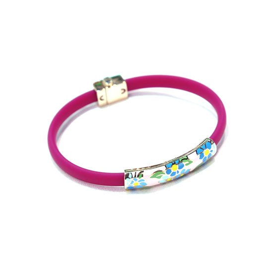 Displayed is a silver bangle coming with a pink finish. The silver portion is accented with colorful, floral patterns. Spice up your summer outfit with this silver bangle.