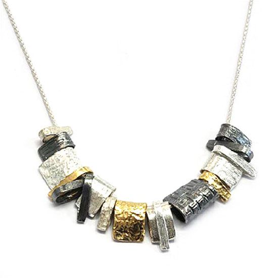 This silver necklace features silver beads in gold, gray, light-gray and tarnished gray colors. The silver beads are stylishly shaped and designed with a textured finish for a trendily metallic style. This necklace is a perfect item for all fashionistas.