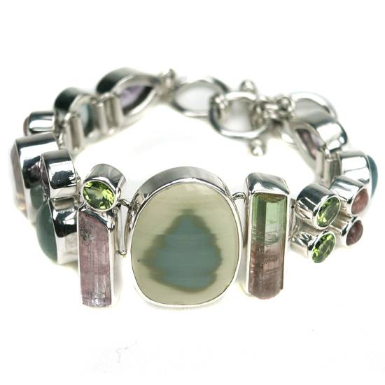 This 925 silver bracelet is set with a number of semi-precious stones. The featured stones include imperial jasper, tourmaline and peridot. Available in various sizes and shapes, with rectangular, circular, pear-shaped pieces set along the bracelet.