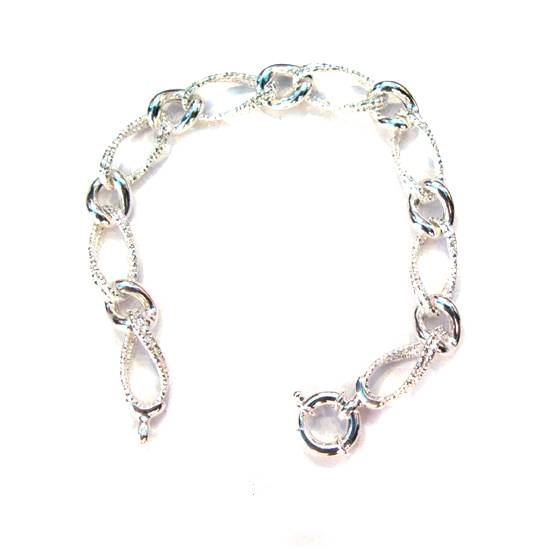 The bracelet features silver pieces of two sizes. The bigger-sized ones are equipped with diamonds, while the smaller ones show a nearly circular shape. They show up alternatively along the bracelet, seemingly making the piece look more balanced.