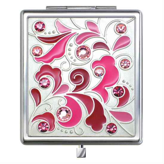 Square shape. Flowering plant design in pink and garnet colors, embossed, with color stones.