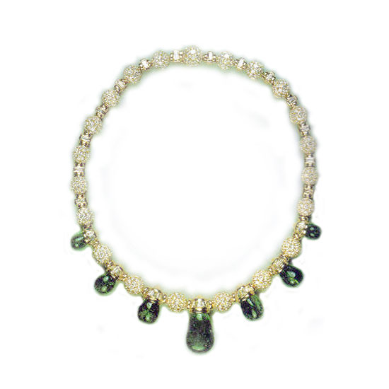 This is a stylish necklace that is finely crafted of silver and shimmers with a highly glossy finish. It is accented with polished and well-cut emerald gemstones for a decorative touch. This gorgeous necklace is surely an ideal addition to complete your jewelry box.